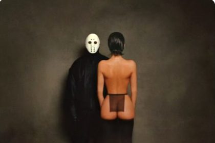 كاني ويست يكشف النقاب عن غلاف ألبوم Vultures Volume 1 الذي يظهر فيه وهو يرتدي قناع الجمعة المستوحى من الثالث عشر وزوجته بيانكا سينسوري عاريات الصدر