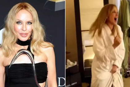 تحتفل كايلي مينوغ بفوزها الثاني على الإطلاق بجائزة جرامي من خلال القفز مرتدية رداء الحمام فقط