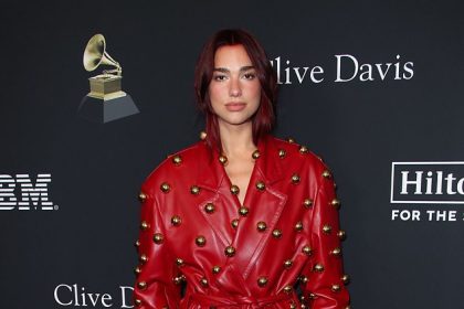دوا ليبا تتألق بمعطف من الجلد الأحمر مزين بكرات ذهبية معدنية وهي تقود النجوم في حفل ما قبل جرامي الشهير الذي أقامه كلايف ديفيس