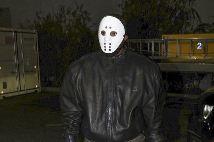 كاني ويست يبث قناة جيسون فورهيس من يوم الجمعة الثالث عشر وهو يرتدي قناع الهوكي بشكل غريب في مباراة كرة السلة لابن سانت في لوس أنجلوس