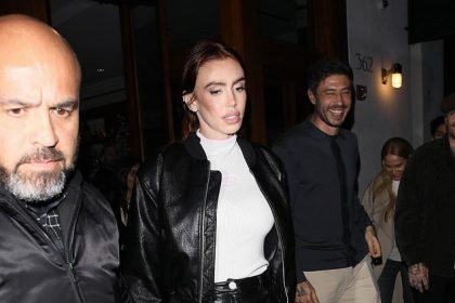 تعرض بيترا إيكلستون ساقيها الطويلتين في سترة جلدية سوداء صغيرة وسترة مطابقة بينما تذهب لتناول العشاء مع زوجها سام بالمر في بيفرلي هيلز