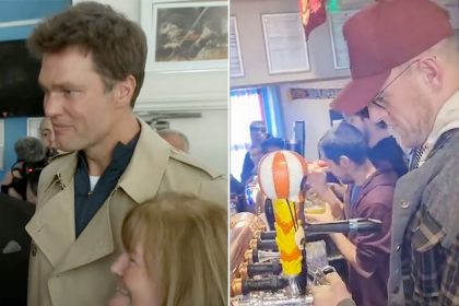يقلد جي جي وات حركة منافسه توم برادي في دوري كرة القدم الأمريكية عندما يلتقي بمشجعي بيرنلي قبل مباراة وست هام