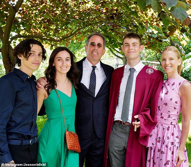 شاركت جيسيكا، زوجة جيري سينفيلد، 52 عامًا، صورة عائلية نادرة من حفل تخرج ابنهما الأصغر شيبرد من المدرسة الثانوية يوم الثلاثاء، حيث انضم إليها أيضًا زوجها، 70 عامًا، وابنتها ساشا، 23 عامًا، وابنها الأكبر جوليان، 21 عامًا.