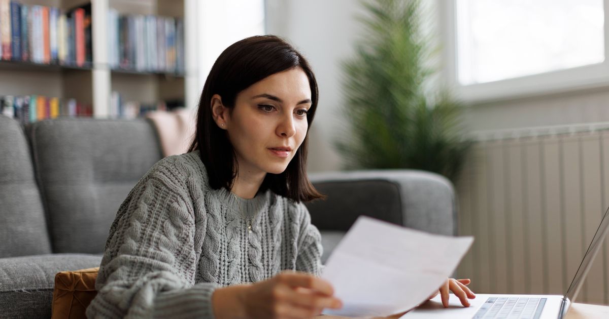 رجل وامرأة يبتسم ينظران إلى الأوراق معًا.