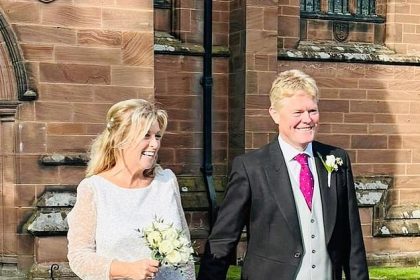 تزوجت لوسي ميكوك، من قناة ITV News، البالغة من العمر 64 عامًا، من زوجها جوناثان مرتديًا ثوبًا أبيض لامعًا مذهلاً وشاركت تحية مؤثرة لوالدها الراحل