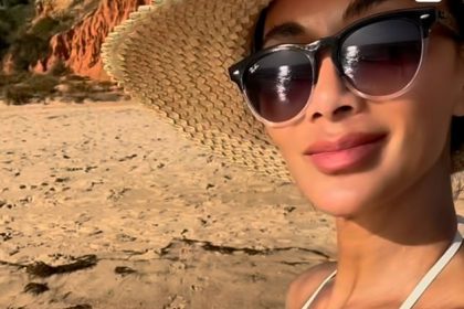 نيكول شيرزينجر تستعرض قوامها المذهل ببيكيني قصير بينما تقبل خطيبها توم إيفانز بشغف في إجازة في البرتغال