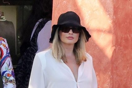 مارجوت روبي الحامل تحتضن بطنها المنتفخ بقميص أبيض مفتوح الأزرار بينما تستمتع بشهر العسل الجميل مع زوجها توم أكيرلي في سردينيا