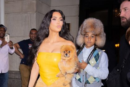كيم كارداشيان ترتدي بلوزة من مادة PVC من Miu Miu بينما تنسق ملابسها مع كلبها الأليف سوشي أثناء مغادرتها فندقها مع ابنتها نورث في نيويورك