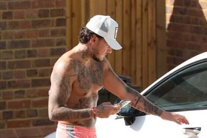 صديق كاتي برايس جيه جيه سلاتر يكسر الغطاء وهو يتجه إلى سيارته عاري الصدر خارج منزل عارضة الأزياء بينما تم إطلاق سراح النجمة بكفالة بعد ساعات من اعتقالها في مطار هيثرو