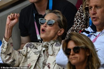 شارون ستون تظهر بإطلالة متحركة مرتدية زيًا زهريًا أثناء تشجيعها لنهائي مباراة التنس للرجال في أولمبياد باريس 2024