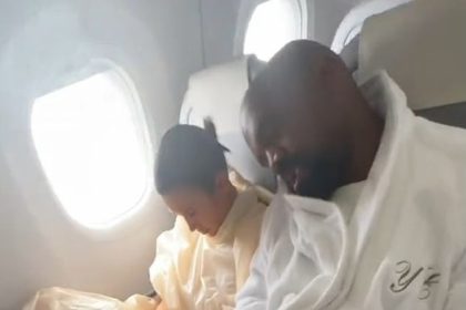 الملياردير كاني ويست يرتدي رداء “Ye” المخصص ويأخذ قيلولة بينما يستقل هو وزوجته بيانكا سينسوري رحلة اقتصادية إلى اليابان