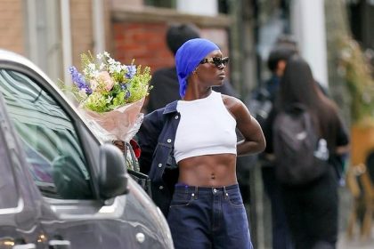 جودي ترنر سميث تظهر عضلات بطنها مرتدية قميصًا قصيرًا وجينزًا بينما تشق طريقها عبر لندن حاملة مجموعة كبيرة من الزهور