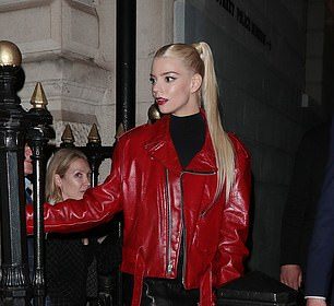 أنيا تايلور-جوي تظهر بمظهر طويل للغاية مرتدية تنورة قصيرة جلدية وسترة حمراء بينما تتجه إلى العرض الأول لفيلم Furiosa: A Mad Max Saga مع كريس هيمسوورث