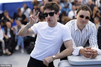 باري كيوغان يرفع علامة السلام وهو يتجول أثناء التقاط الصور لفيلمه Bird في مهرجان كان السينمائي