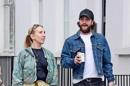 آرون تايلور جونسون، 33 عامًا، يرتدي مظهر الدنيم المزدوج بينما يشرب القهوة أثناء نزهة مشمسة مع زوجته سام، 57 عامًا