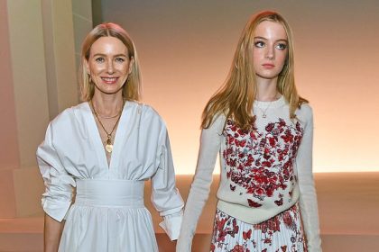 ناعومي واتس وطفلها الأصغر كاي، 15 عامًا، ينظران إلى صورة البصق لبعضهما البعض أثناء خروجهما بعباءات ساحرة خلال عرض أزياء ديور