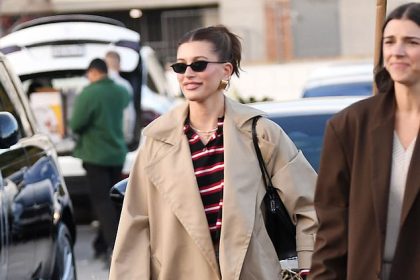 هايلي بيبر تظهر بشكل أنيق في بلوزة مخططة مع بنطال جينز ومعطف بني أثناء توجهها إلى Erewhon في لوس أنجلوس