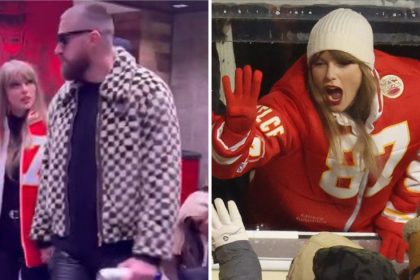 شوهد تايلور سويفت وترافيس كيلسي يمسكان بأيديهما أثناء وضعهما الحجة الأولى خلفهما