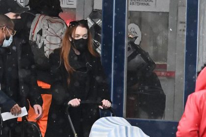 ليندسي لوهان وابنها لؤي، خمسة أشهر، شوهدا لأول مرة علنًا عندما وصلت هي وزوجها بدر شماس مع طفلهما إلى مطار جون كينيدي في مدينة نيويورك