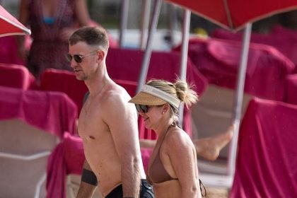 زوجة جو هارت، كيمبرلي كرو، تستعرض قوامها المذهل بالبيكيني البني بينما تنضم إلى حارس المرمى بدون قميص على الشاطئ في بربادوس
