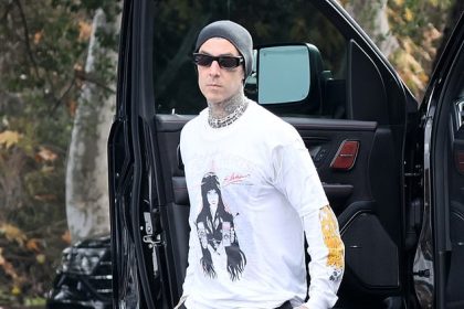 يحافظ ترافيس باركر على الدفء في قبعة رمادية وقميص مرسوم أثناء تواجده في سوق المزارعين في كالاباساس