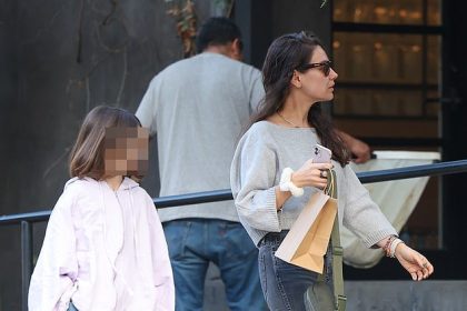 ميلا كونيس ترتدي سترة رمادية قصيرة بينما تتوجه هي وابنتها وايت، 9 سنوات، إلى صالون لتصفيف الشعر في لوس أنجلوس