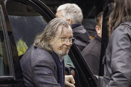 خيول بطيئة جدا! يبدو غاري أولدمان ذكياً ببدلة رمادية عندما تعطلت سيارته السوداء أثناء تصوير مسلسل جديد في لندن الممطرة