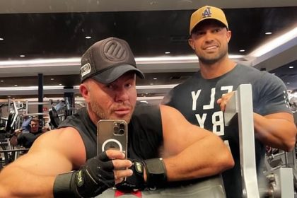 يُظهر المصمم Alex Perry لياقته البدنية ووجهه المشدود للغاية في صورة شخصية نادرة في صالة الألعاب الرياضية وهو يمتدح مدربه الشخصي ويضيف رمزًا تعبيريًا للغوريلا