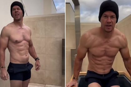 يظهر مارك والبيرج، 52 عامًا، عضلات بطن منحوتة وهو يغطس في حمام جليدي متجمد