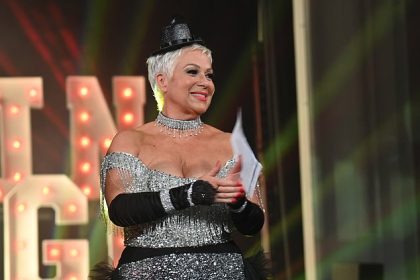 دينيس ويلش، 65 عامًا، تتألق في سروال ساخن مزين بالترتر وجوارب شبكية بينما تستضيف حفلة خيرية تحت عنوان مولان روج