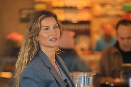 جيزيل بوندشين، 43 عامًا، متألقة دون عناء وهي ترتدي سترة رمادية وسروال جينز لإطلاق عصيرها الجديد Erewhon