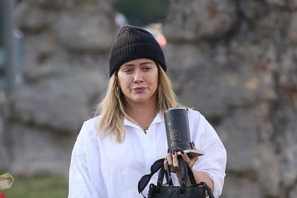الحامل هيلاري داف تغطي بطنها بقميص أبيض بأزرار وترتدي قبعة سوداء كما تظهر مع ابنها لوكا، 11 عامًا، في لوس أنجلوس