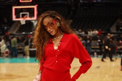 تظهر ويني هارلو شخصيتها النموذجية في بذلة حمراء وهي تهتف لصديقها كايل كوزما خلال مباراة الدوري الاميركي للمحترفين في واشنطن