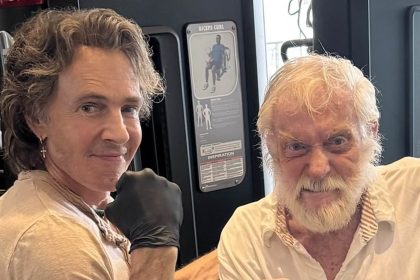 ديك فان دايك ، 99 عامًا ، يثني عضلاته في صالة الألعاب الرياضية مع صديق مشهور غير محتمل