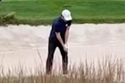 لحظة محرجة ، تفقد بروكلين بيكهام كرة الجولف أمام المشجعين المحارين ويتعلق مرارًا وتكرارًا في أحد المستودعات بعد الانطلاق في بطولة كأس رايدر