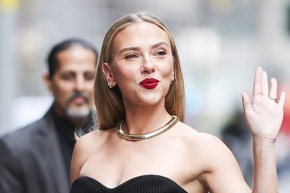 Scarlett Johansson يذهل في فستان ميدي أنيق بدون حزام عند وصولها إلى العرض المتأخر في نيويورك