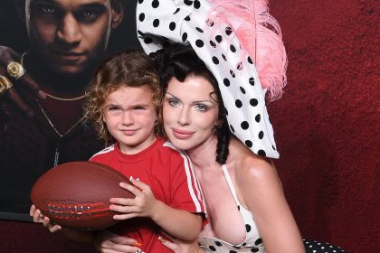 جوليا فوكس تظهر مظهرًا نادرًا للسجادة الحمراء مع الابن فالنتينو ، أربعة ، وهي ترتدي فستان مشد في بولكا دوت إلى العرض الأول له في هوليوود