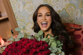 قامت بإكسسواراتها بأقراط فضية وصممت أقفالها السمراء بشكل مستقيم في فراق جانبي.