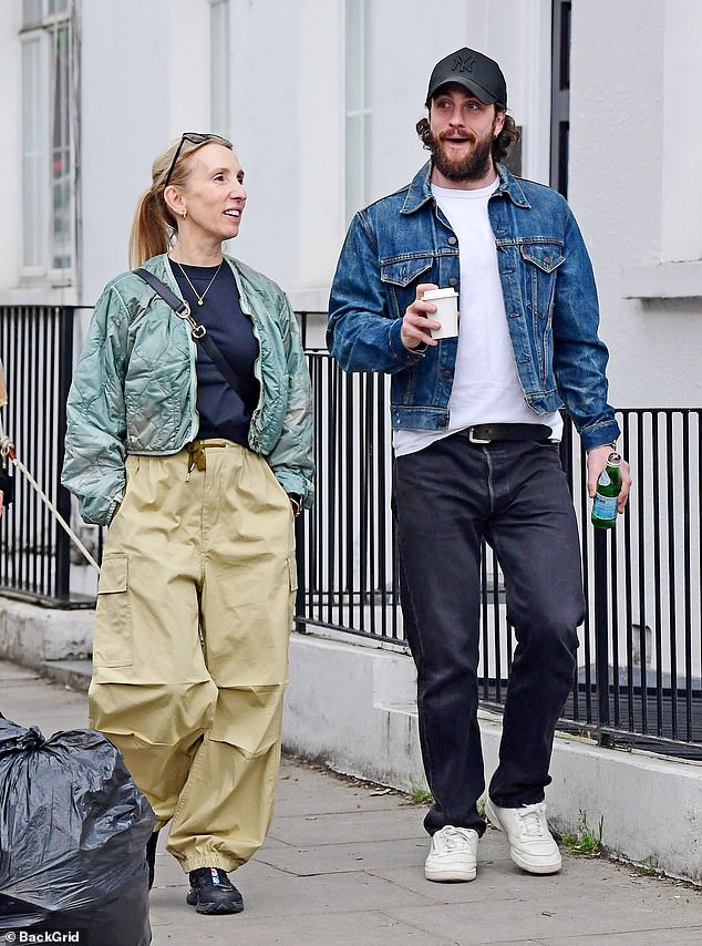 استمتع آرون تايلور جونسون، 33 عامًا، الذي يرتدي الجينز، بفنجان من القهوة بينما انضم إلى زوجته سام، 57 عامًا، في نزهة مشمسة حول لندن يوم الخميس.