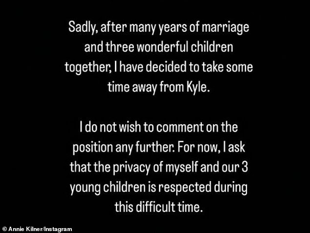 وكتبت آني في بيانها: “للأسف، بعد سنوات عديدة من الزواج وإنجاب ثلاثة أطفال رائعين معًا، قررت أن آخذ بعض الوقت بعيدًا عن كايل” (شوهد مع كايل).