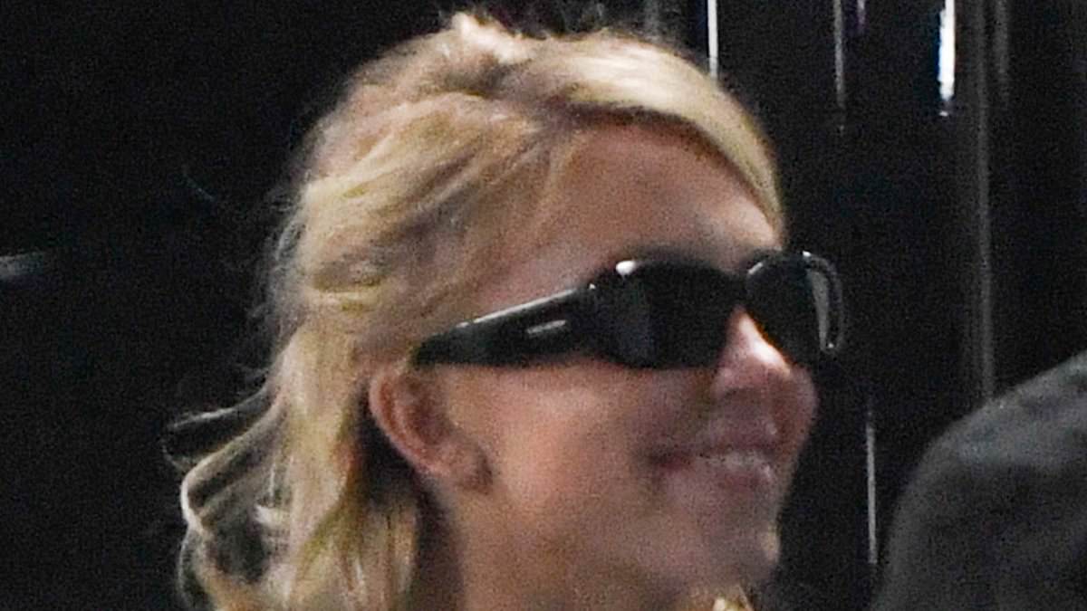 تم سحب أقفالها الشقراء القصيرة جزئيًا بعيدًا عن وجهها لأنها كانت ترتدي أيضًا زوجًا من الظلال السوداء العصرية.