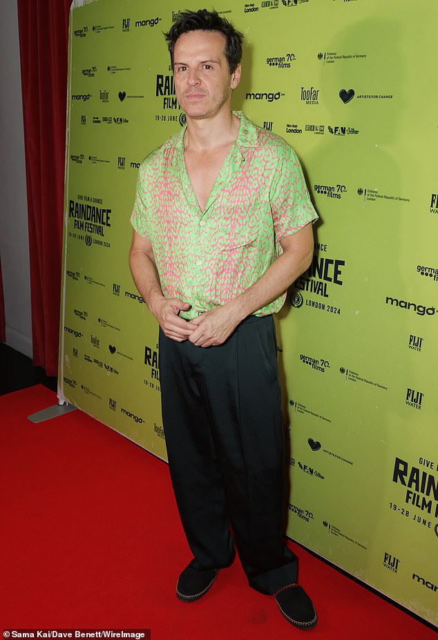 كشف أندرو سكوت عن صدره بقميص كوبي وردي وأخضر نابض بالحياة أثناء حضوره العرض العالمي الأول للفيلم الأيرلندي Kathleen Is Here في مهرجان Raindance السينمائي.