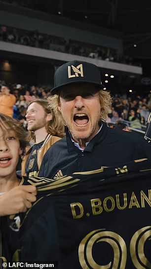 وشوهد ويلسون وأبناؤه يحتفلون بعودة الفريق في تعادله، ويدعمون قميص كرة القدم للاعب لوس أنجلوس دينيس بوانجا مع الرقم 99 في متناول اليد.