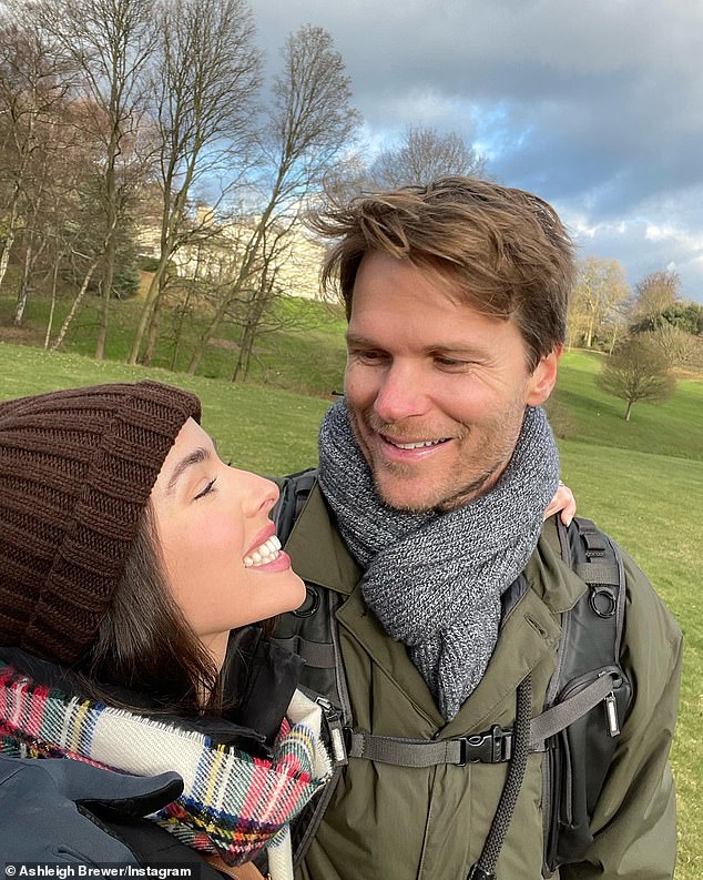 في الصورة الأولى، تظهر آشلي، 33 عامًا، وهي تحدق بسعادة في زوجها الذي سيكون في مكان خارجي.