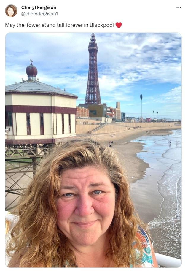 تعرضت نجمة EastEnders شيريل فيرجسون للسخرية من قبل مستخدمي وسائل التواصل الاجتماعي يوم الخميس بعد مشاركتها “تحية” في توقيت سيئ لبرج بلاكبول.
