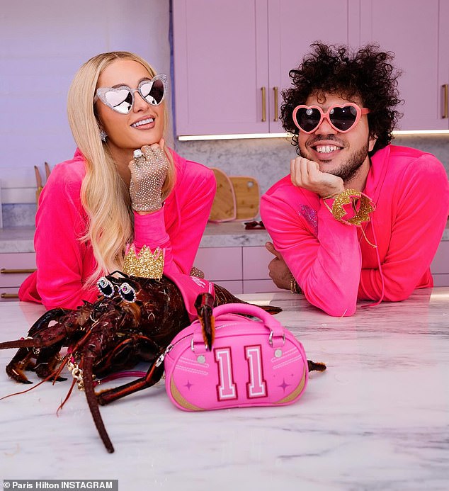 تقول باريس: “ألبسيه ملابسه” قبل أن يضع الزوجان تاجًا على جراد البحر والنظارات المرصعة بالجواهر أثناء تحضيرهما لمشروب بلودي ماري – وضع مشروب أمام جراد البحر