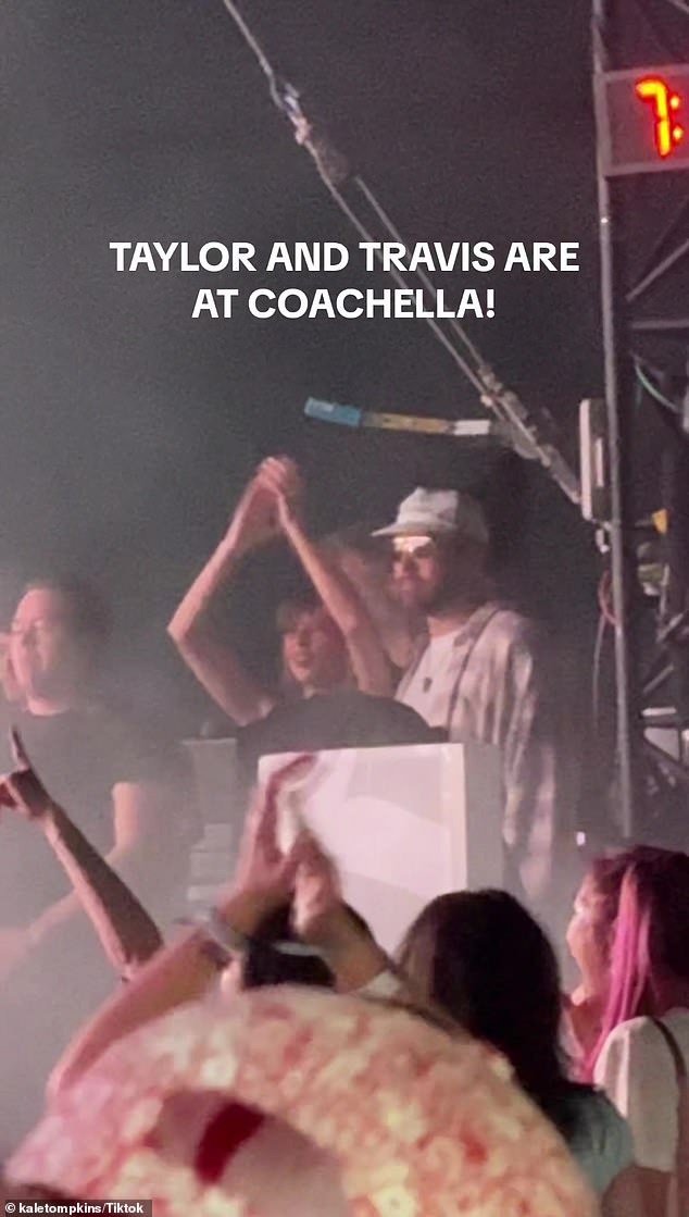 شوهدت تايلور سويفت، 34 عامًا، وصديقها ترافيس كيلسي، 34 عامًا، في كوتشيلا يوم السبت، وهما يشاهدان فرقة صديقها جاك أنتونوف، Bleachers، وهي تؤدي عروضها في المهرجان.