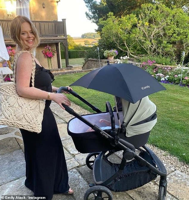 بدت إميلي أتاك، 34 عامًا، متألقة ومتوهجة وهي تدفع ابنها حديث الولادة بارني في عربة الأطفال في صورة رائعة شاركتها يوم الجمعة