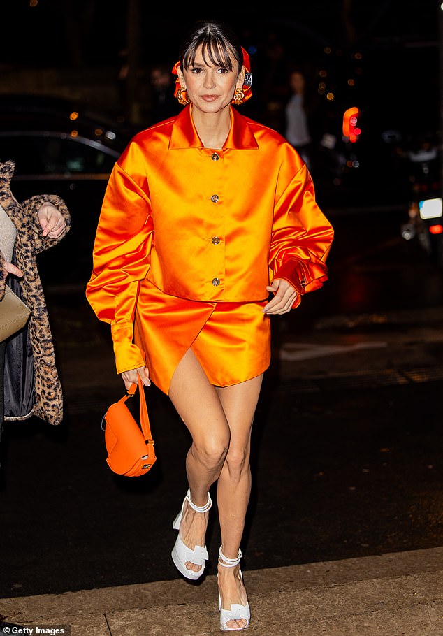 تبدو نينا دوبريف مثيرة وهي ترتدي زيًا برتقاليًا نابضًا بالحياة أثناء زيارتها لمتجر باتو خلال أسبوع الموضة في باريس