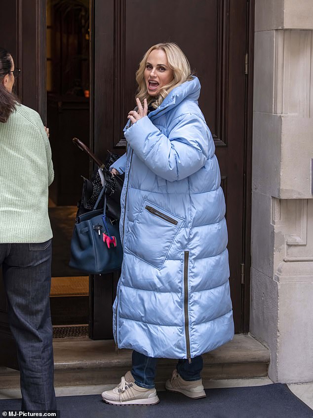كانت ريبيل ترتدي معطفًا طويلًا مبطنًا باللون الأزرق الفاتح أثناء سيرها في العاصمة